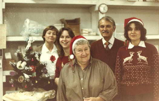 Here, some holiday hijinks in 1982. That’s Bill Pae mugging it up behind Ginny in the first photo, and then replaced by George Ivers in the second. Joseph Chorlton sports the #1 sweatshirt in the third, and the jingle-bell-and-holly girls are Ginny and Patricia Pae.