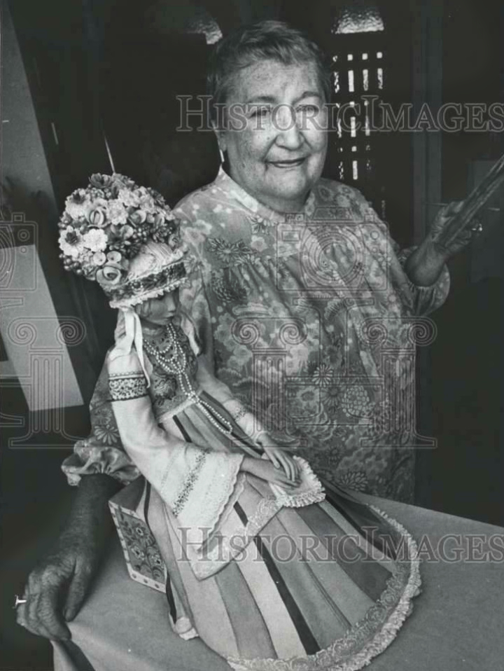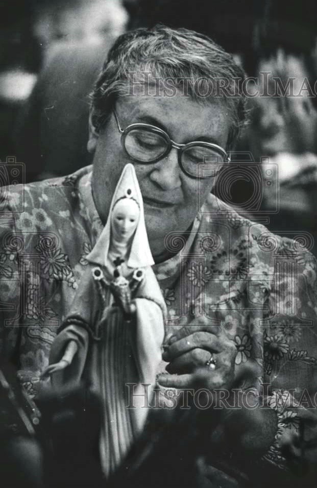 These press photos of her with a ‘Polish Bride‘ were taken in 1980 when that sculpture was introduced. The color photo was published in a local newspaper on July 24th with the title “At 70, she’s become [a] classic Cybis herself” and the photo is credited to the paper’s staff photographer Bill Saunders. The text below the image reads