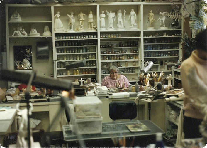 This candid snapshot of Ginny at her table, painting a Branigan and Clancy, was taken in September 1984.