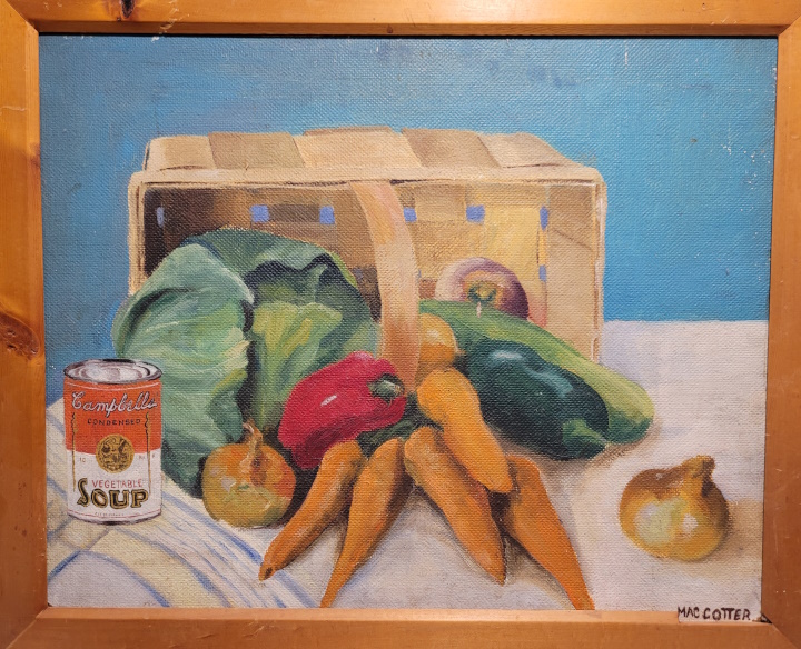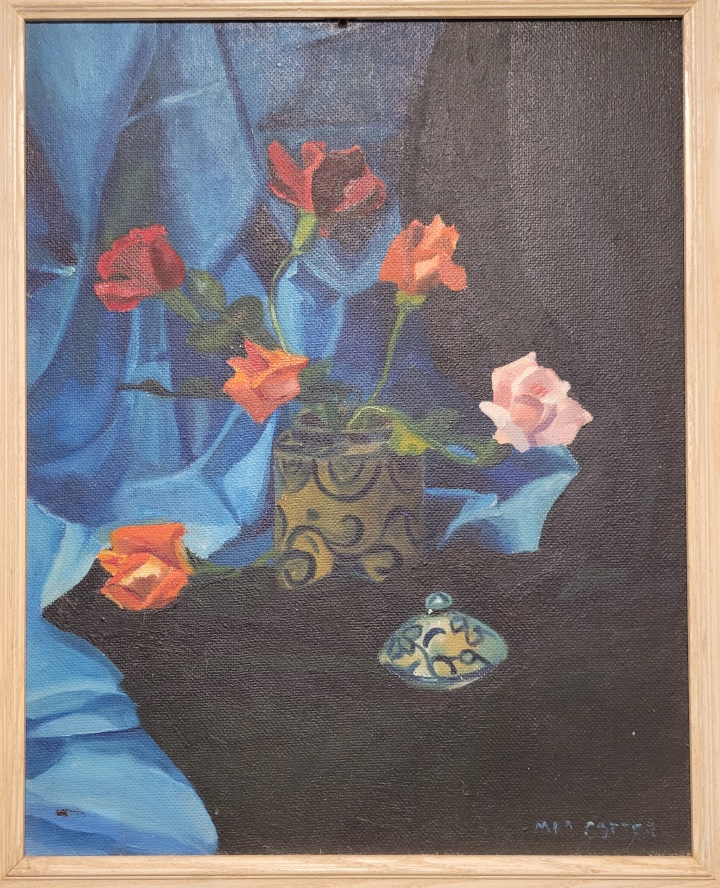 Her grandson Sean shared these photos of two of her many paintings that filled her home studio: Still Life with Veggies and Soup, and Red Roses and Blue Silk. The blue-on-white pattern on the vase is very reminiscent of the blue-curlicue design that is found on many of the 1940s Cordey figurines, and on several early Cybis ones as well.